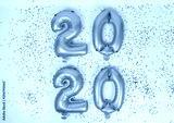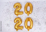 2020 number of frustrated gold balloons isolated with colored confetti on white background. Happy new year 2020 holiday.
