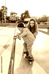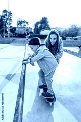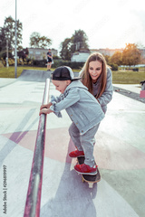 Young mother woman with little boy son 4-5 years old, learns ride skateboard, summer autumn in city park playground. Skateboard, casual wear. Support help balance training. Emotions of joy and fun.