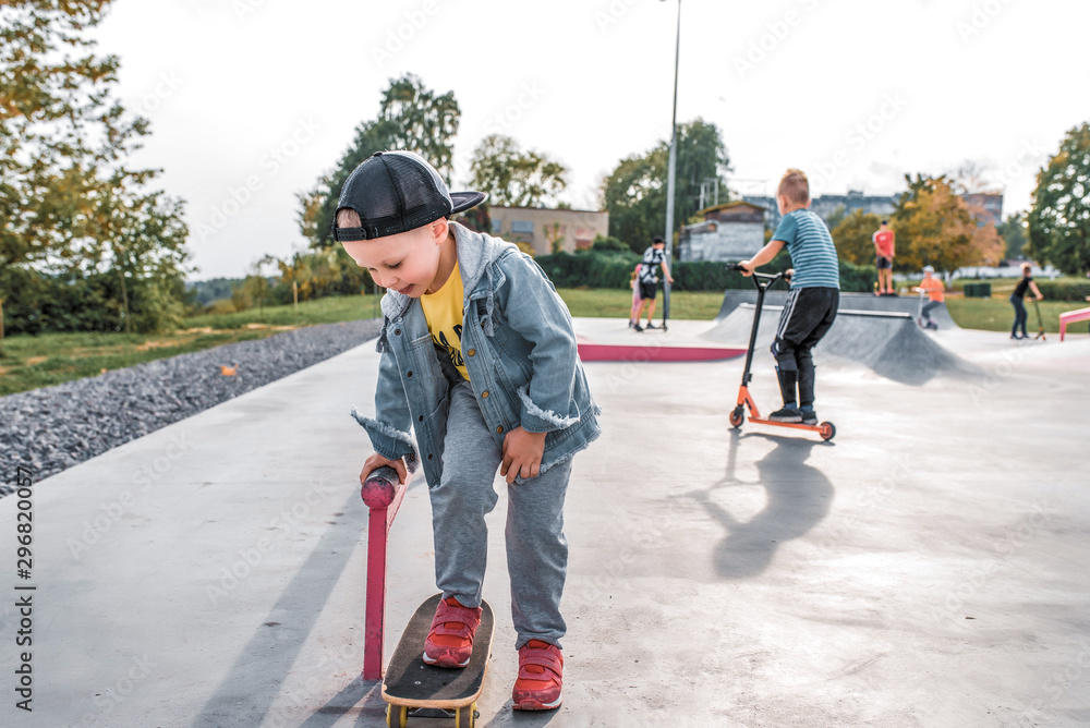Little boy 4-5 years old, autumn summer in city on sports field, learning to ride skateboard, happy smiling, free space text. Casual wear denim cap, sneaker pants. Background kids teens.