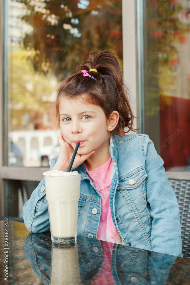 Funny smiling Caucasian preschool girl drinking milk shake with paper straw in cafe. Child kid having fun in restaurant patio enjoying food drink. Happy authentic childhood lifestyle.