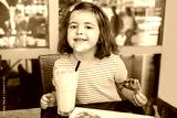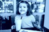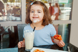 Funny Caucasian preschool toddler girl drinking milk shake in cafe. Child kid having fun in restaurant patio enjoying food drink. Happy authentic childhood lifestyle.