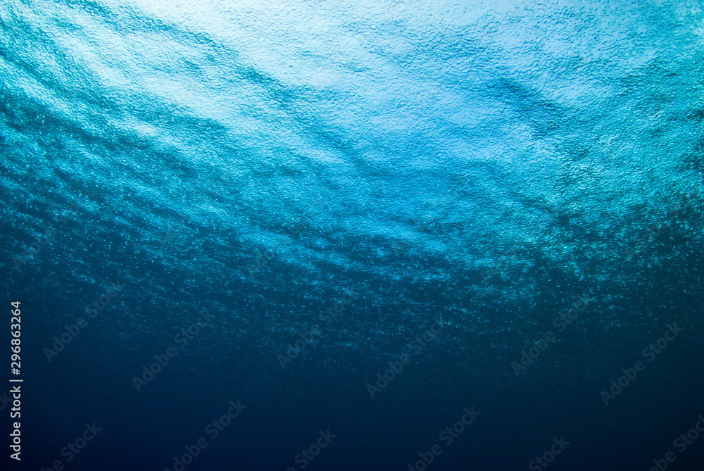 A shot taken from beneath the surface of the sea looking up at the sky. The light patch is the sun overhead and through the surface it is possible to see the rain falling hard on the water