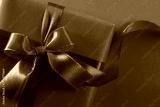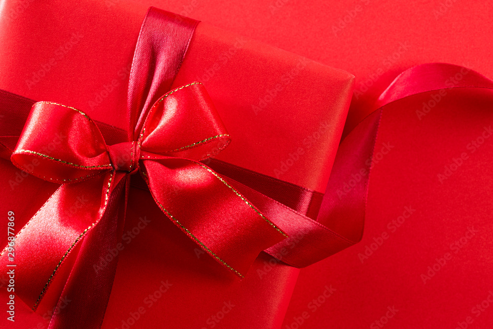 Top view of red christmas boxes with red ribbon on black background with copy space for text. black Friday and Boxing Day composition.