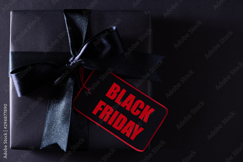 Top view of black christmas boxes with red paper tag on black background with copy space for text. black Friday composition.