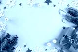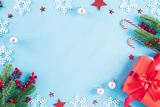 Christmas holidays composition Top view of red gift box with Christmas tree decoration and red berries on blue pastel background with copy space for text.