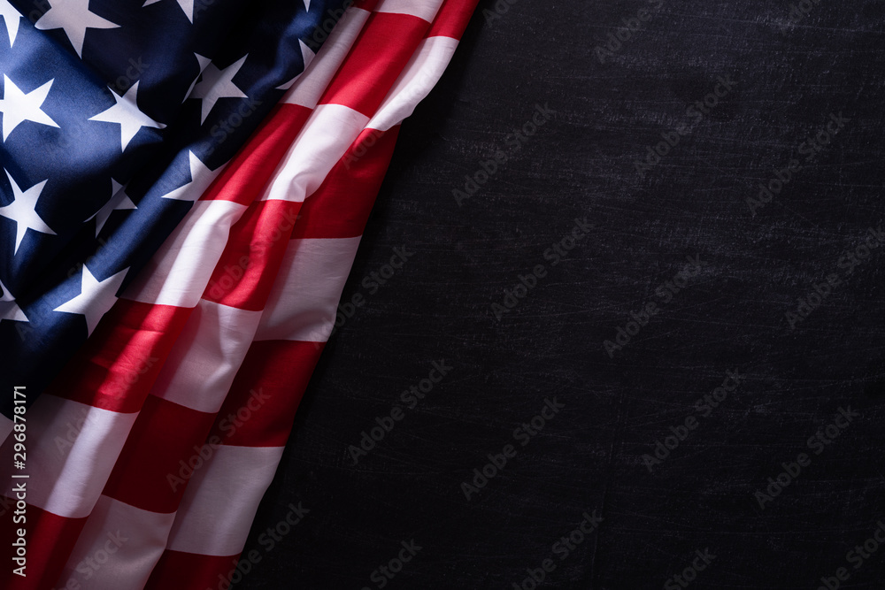 Happy Veterans Day. American flags veterans against a blackboard background.