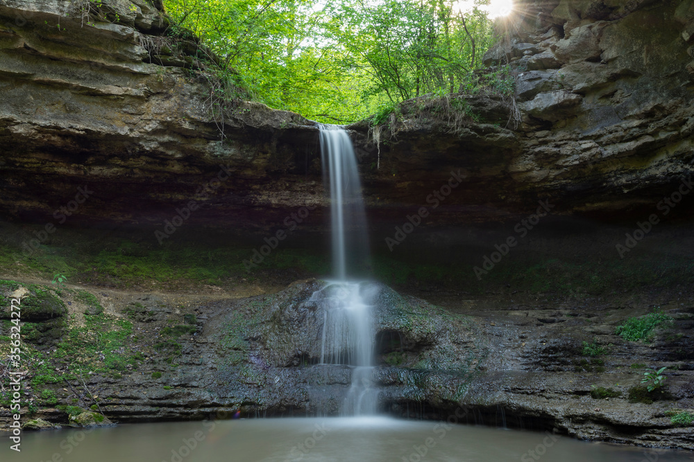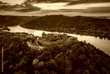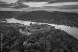 Visegrad, Hungary - Aerial drone view of the beautiful high castle of Visegrad with autumn foliage and trees. Dunakanyar and golden sunset at background