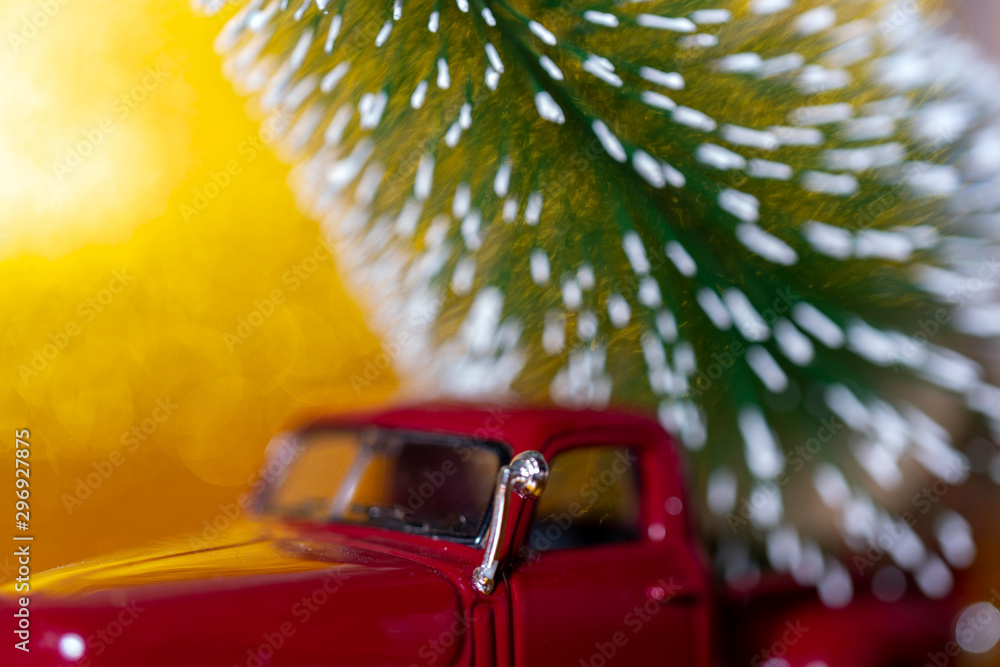 Toy car carries Christmas tree for holiday.