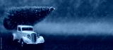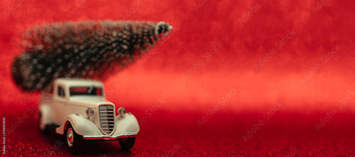 Toy car carries Christmas tree for holiday.