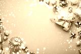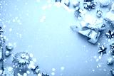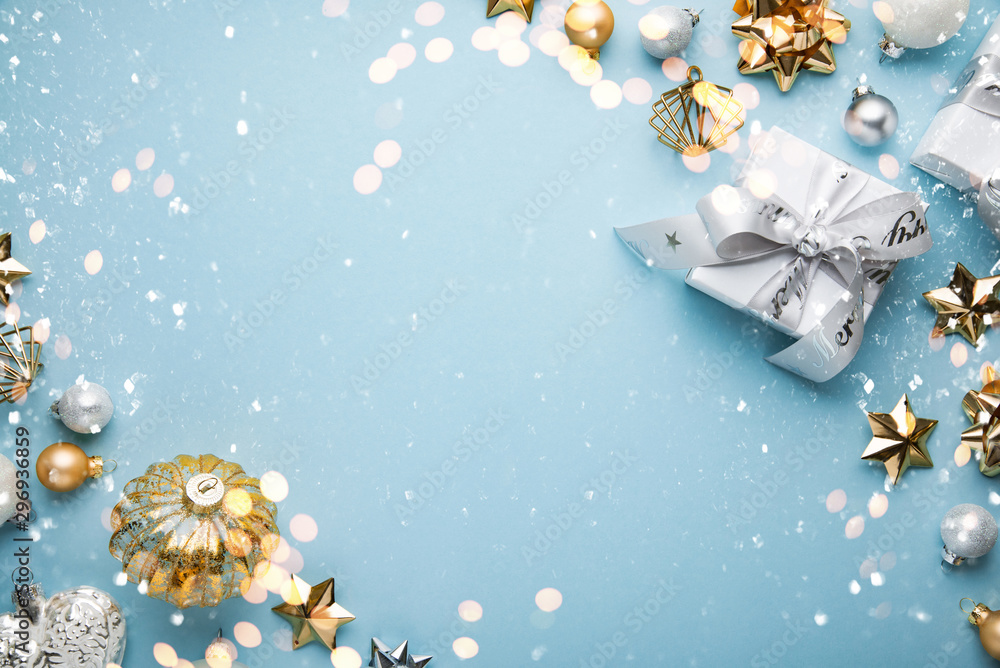 Merry Christmas and Happy Holidays greeting card, frame, banner. New Year. Noel. Christmas white and gplden ornaments and gifts on blue background top view. Winter xmas holiday theme. Flat lay.