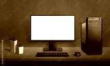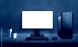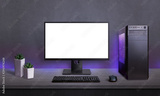 Gaming PC with isolated screen for mockup, app or game presentation. Modern case with RGB light, keyboard and mouse on desk.