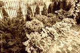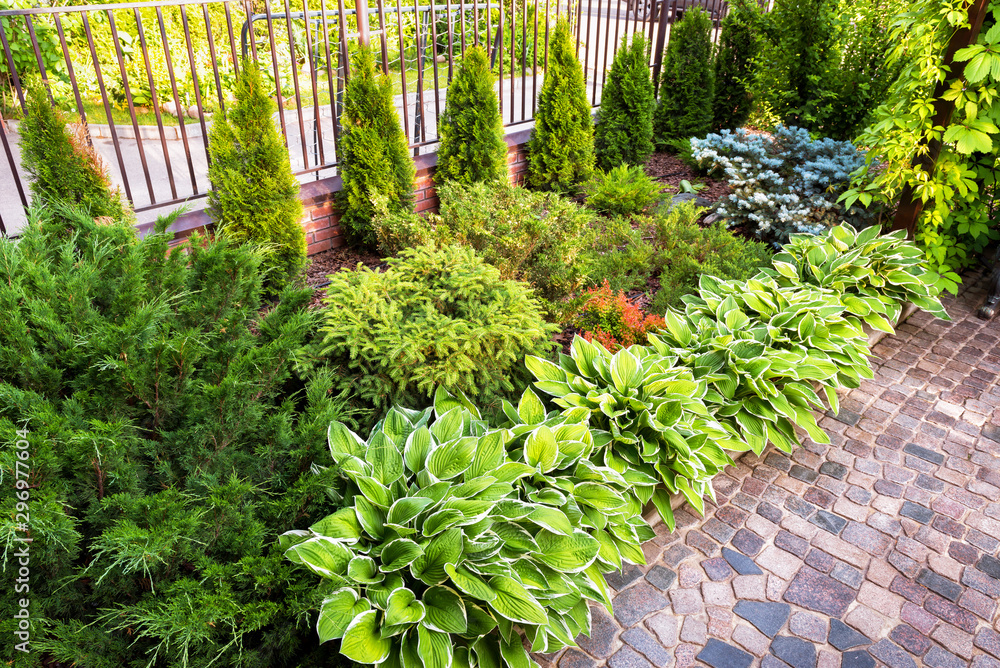 Landscaping in home garden. Beautiful natural landscape design with flower beds in summer. Scenic view of landscaped part with plants and stones in yard or backyard of residential house.