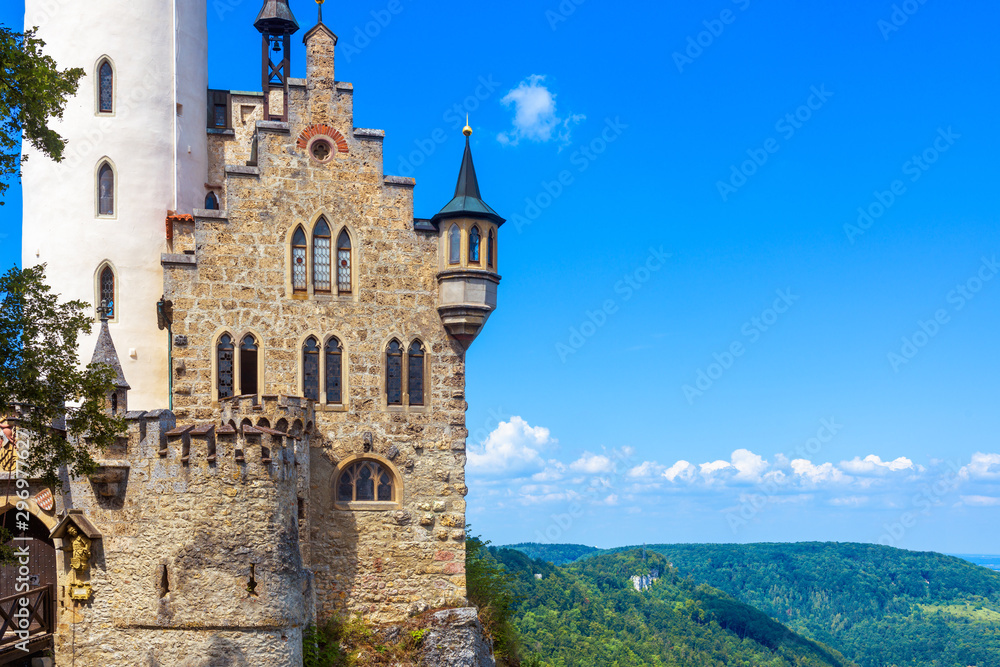 Lichtenstein Castle on blue sky background, Germany. Fairytale castle on cliff.