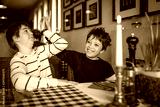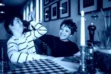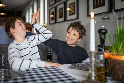 Boys waiting for pizza in a restaurant, bored brothers playing together.