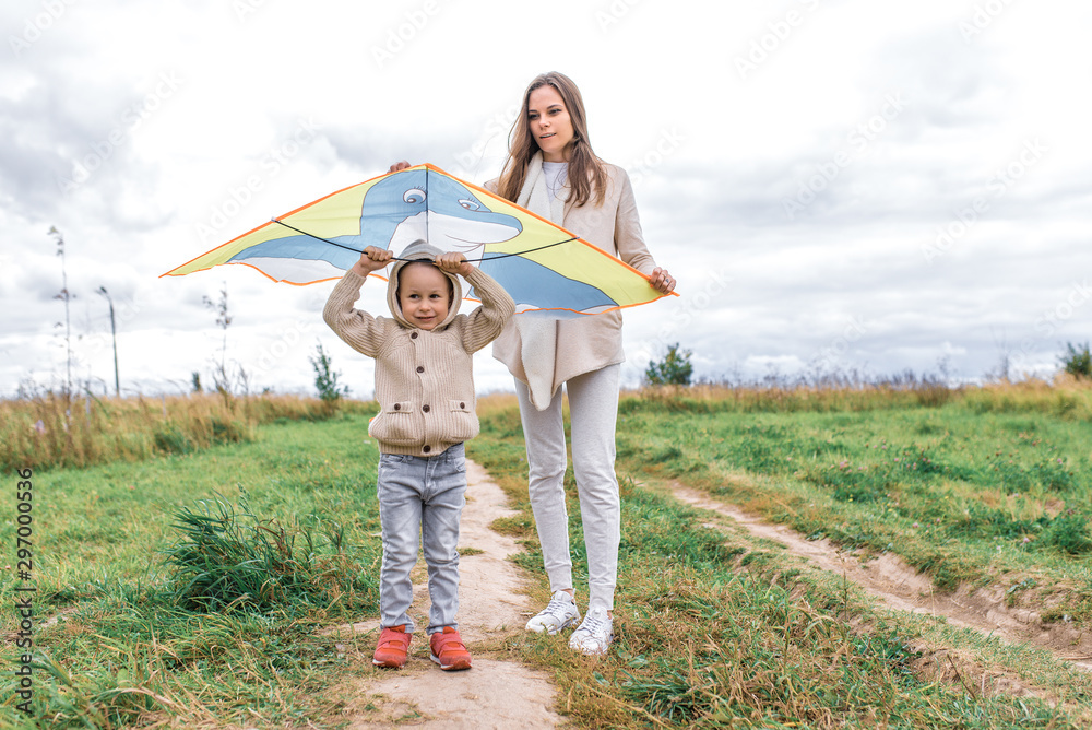 Mom woman with little boy son 4-5 years old, kite launched in park. Happy people play laughing having fun positive emotions, warm clothes in fall, in sweater with hood. Free space for text.