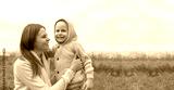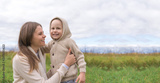 Mom woman with a little boy son 4-5 years old, in park. Happy play laughing and having fun positive emotions of joy and laughter, warm clothes in fall, in sweater with hood. Free space for text.