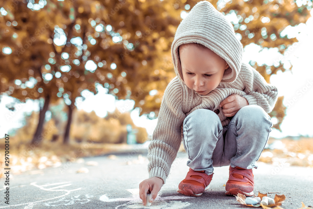 Little boy 4-5 years old, draws with crayons on pavement, in a warm sweater with a hood, creates creative drawings, In summer in autumn park. Background of autumn leaves .