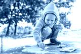 Little boy 4-5 years old, draws with crayons on pavement, in warm sweater with a hood, creates creative drawings, In summer in autumn park. Background green trees and autumn leaves.