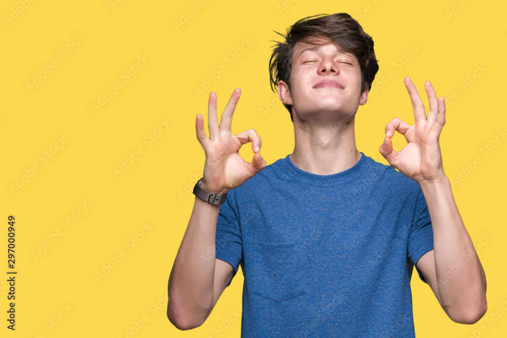 Young handsome man wearing blue t-shirt over isolated background relax and smiling with eyes closed doing meditation gesture with fingers. Yoga concept.