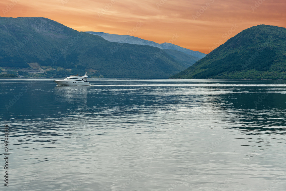 Sunset sea fjord mountain landscape with yacht boat, Norway, Rosendal.