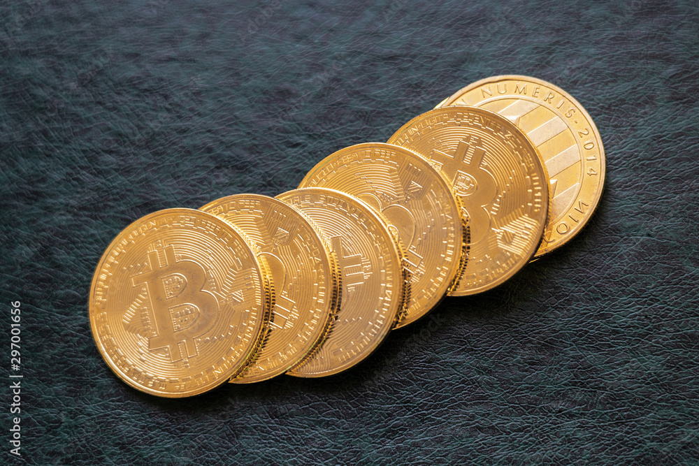 Bitcoin coins criptocurrency on dark background, financial conceptual image