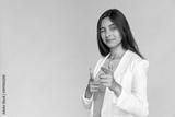 Cheerful young adult indian businesswoman in white suit winking and pointing at camera with index fingers. Smiling girl standing isolated on grey background with copy space