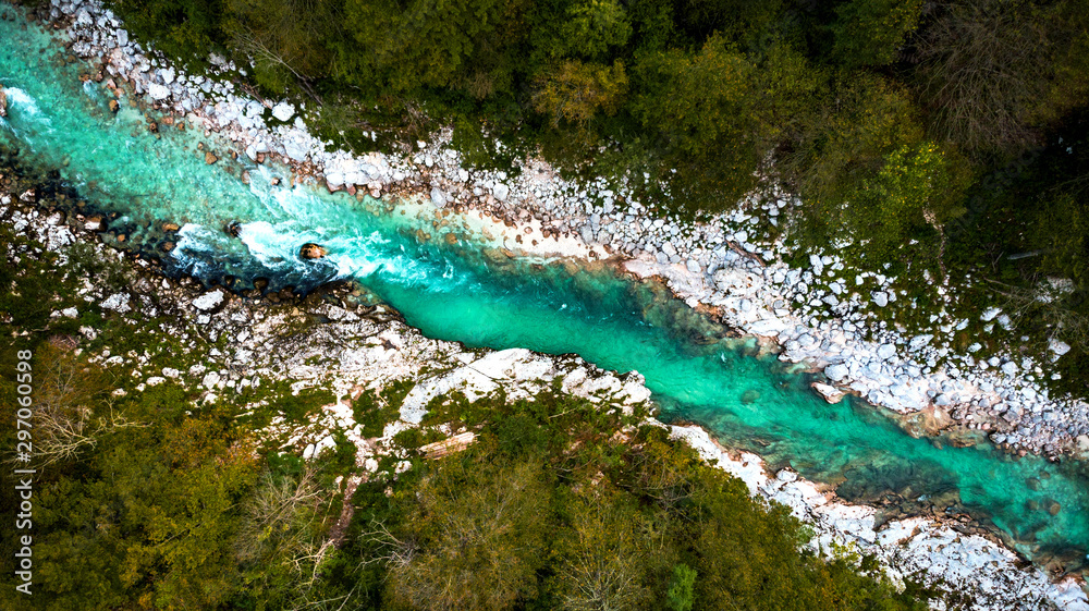 Turquoise Emerald Soca River in Soca Valley,Slovenia. Top Down Drone View