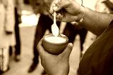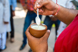 Close-up of man hand enjoying lassi a milk product in cup made of clay, eco environment friendly vessel no plastic concept.