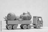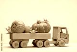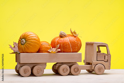 Orange pumpkins and dry maple leaves in wooden toy truck. Wooden background, yellow background, studio shot. Happy Halloween.