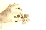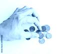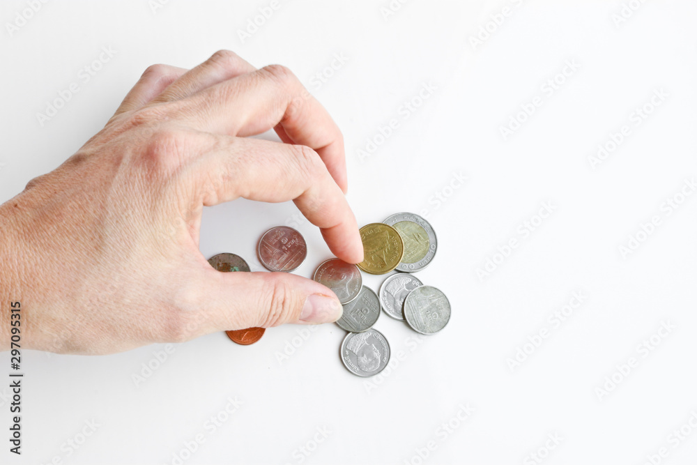 Female hand counts and touches Thai coins. Thai money trifle.