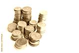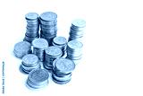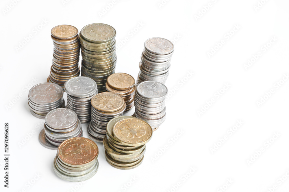 Columns of coins of Russian rubles on a white background. Outdated Russian currency. Double-headed eagle on the back of coins. Copy