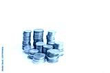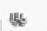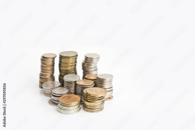 Columns of coins of Russian rubles on a white background. Outdated Russian currency. Double-headed eagle on the back of coins. Copy