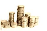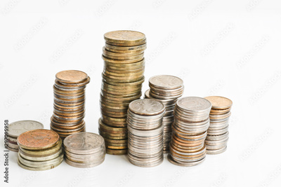 Columns of coins of Russian rubles on a white background. Outdated Russian currency. Double-headed eagle on the back of coins. Copy