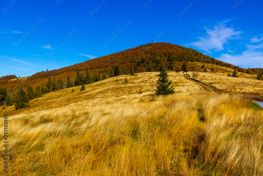 Autumn mountain is covered with tall yellow grass and coniferous trees
