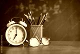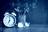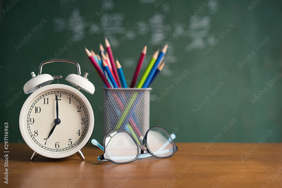Alarm clock white and Colorful pencil, Glasses place on wooden table on blackboard background in classroom. Back to school concept