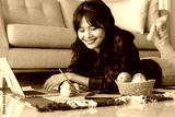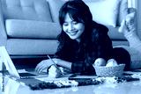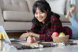 Asian woman is working are using a laptop while lying on the carpet in the living room at home. Women wearing red plaid shirt taking notes and smile