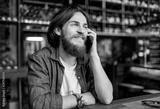 Young bearded brown-haired man talking on mobile phone in a loft cafe