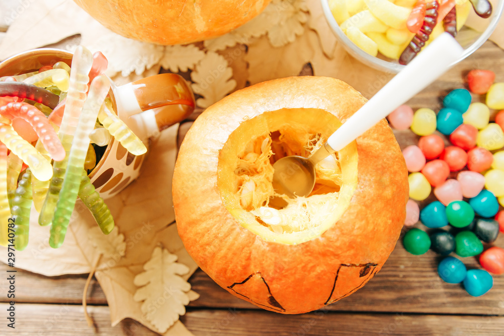 Process of preparation Halloween jack-o-lantern pumpkin at home.