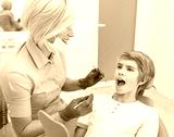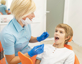 Careful dentist woman examining boy's teeth with a mouth mirror and a probe