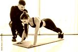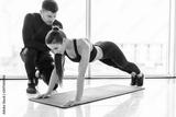 Sporty young couple doing plank exercise in gym. Young man trainer work with fitness woman at gym