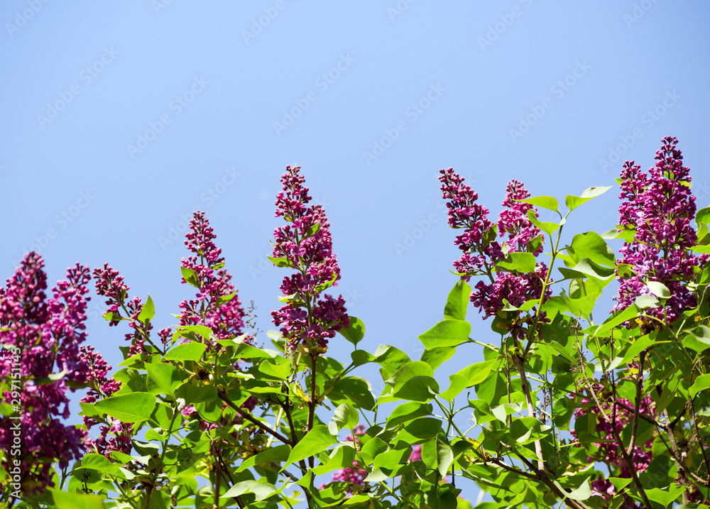 Lilac (Syringa) branches with blossom burgundy color flowers on blue sky background