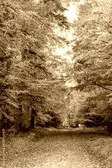 Autumn forest scenery. View to the mountain. Red leaves. Red leaves on a bench. Footpath in scene autumn forest nature. Vivid october day in colorful forest, maple autumn trees road fall way