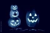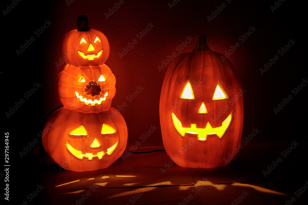 Pumpkins glowing in the dark House porch filled with Halloween spirit.