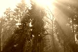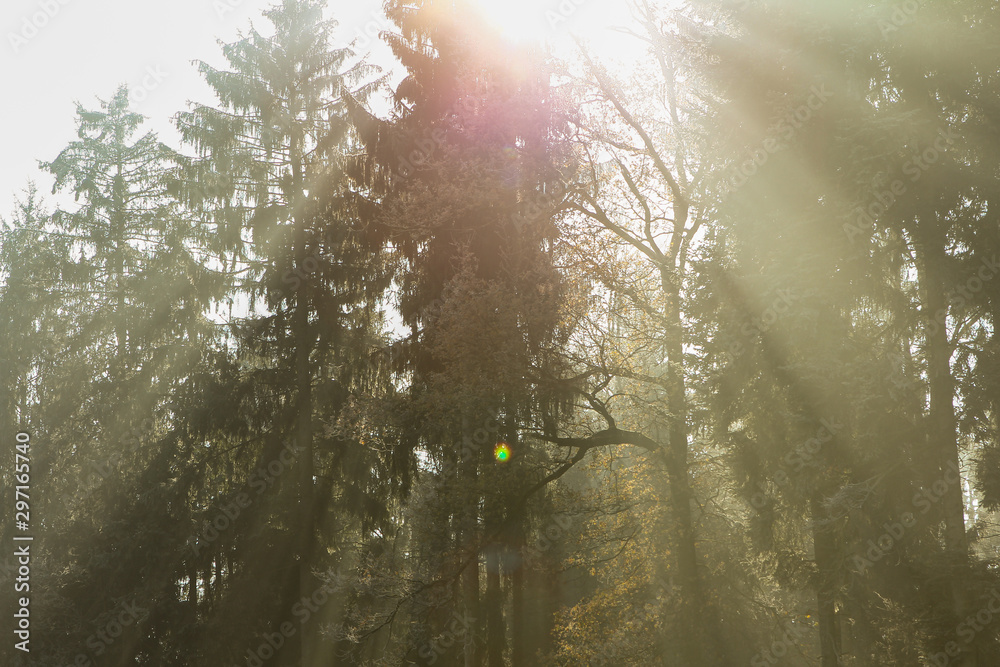Sunrays glowing during sunrise after a foggy night