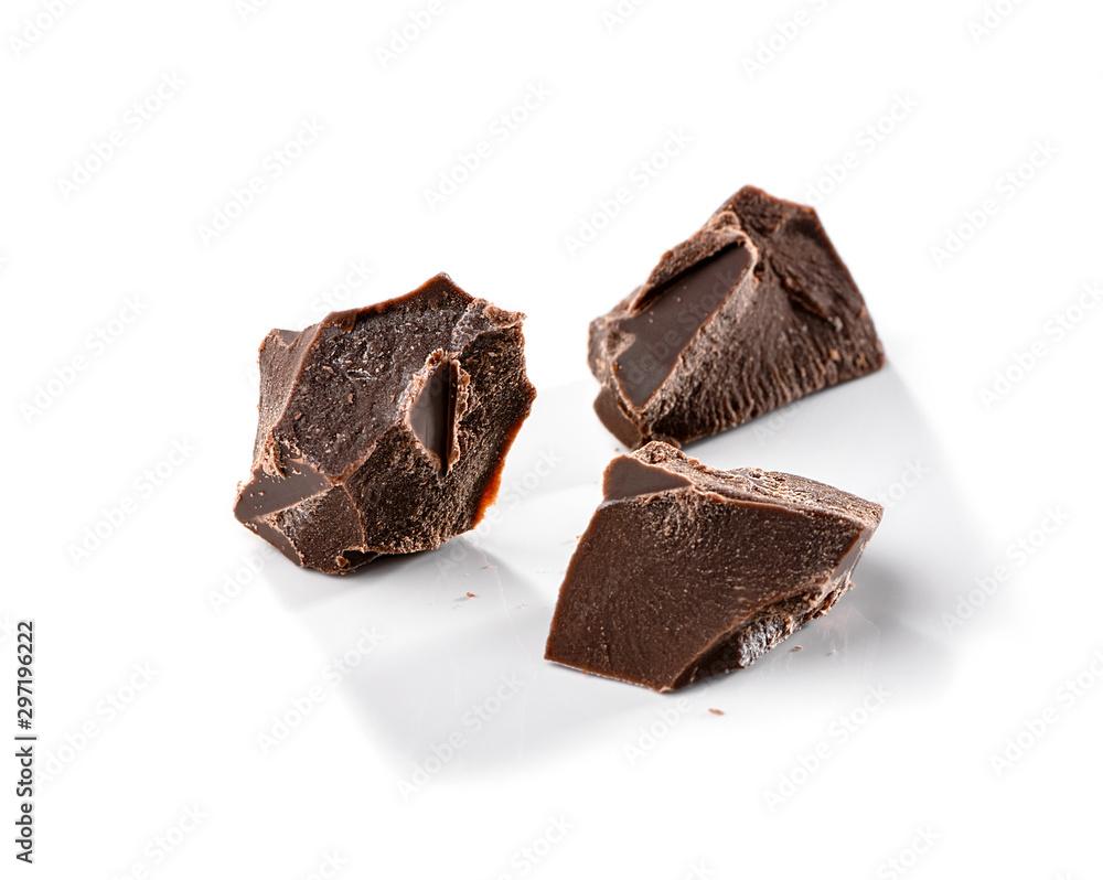 three pieces of broken chocolate slab abstract shape close-up isolated on white background