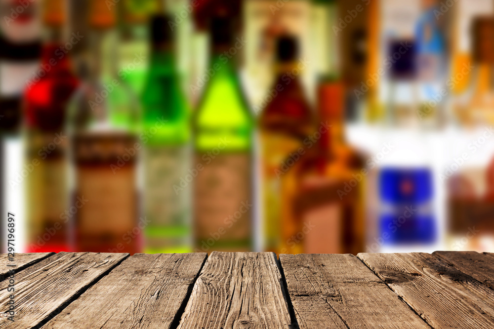 Empty wooden planks against various alcohol bottles in a bar or restaurant. Bar advertisement mockup image