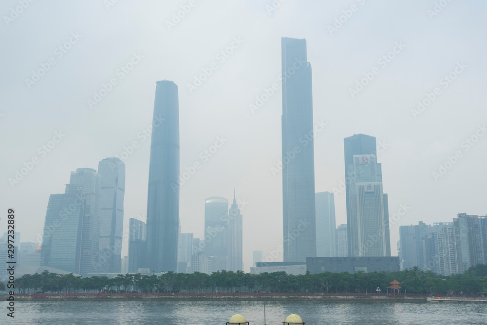 Zhujiang River and modern building of financial district in the mist in Guangzhou, China