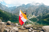 young pretty smiling woman holding poland flag at beach of mountain lake