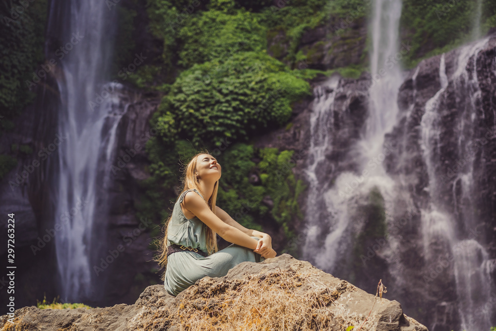 Woman in turquoise dress at the Sekumpul waterfalls in jungles on Bali island, Indonesia. Bali Travel Concept