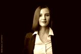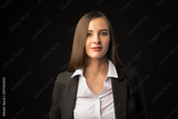 young beautiful brunette girl black background, portrait, straight long dark hair, black jacket, white blouse